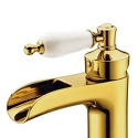 Назначение: для умывальника • Конструкция: однорычажный • Монтаж: горизонтальный • Материал: покрытие - золото • Монтажные отверстия: 1 отверстие • Форма излива: каскадная • Душевая лейка в комплекте: нет • Донный клапан в комплекте: есть