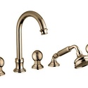 Назначение: ванна+душ • Конструкция: двухрычажный • Монтаж: горизонтальный • Клапан: керамический • Материал: латунь, покрытие - золото • Подводка: гибкая • Монтажные отверстия: 5 отверстий • Форма излива: традиционная • Душевая лейка в комплекте: есть • Аэратор: есть