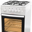 Тип конфорок: газовые • Рабочая поверхность: эмаль • Тип духовки: газовая • Размеры (ШxВxГ): 500x850x600 мм • Цвет: белый • Газовые конфорки: всего - 4 • Объем духовки: 50 л • Максимальная температура духовки: 300 °С • Газ-контроль духовки: есть • Очистка духовки: традиционная • Подсветка: есть • Телескопические направляющие противеней: есть • Тип управления: механическое • Переключатели: поворотные