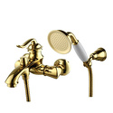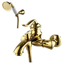 Назначение: ванна+душ • Конструкция: однорычажный • Монтаж: вертикальный • Клапан: керамический • Материал: покрытие - золото • Подводка: жесткая • Монтажные отверстия: 2 отверстия • Форма излива: традиционная • Душевая лейка в комплекте: есть • Держатель для душевой лейки: настенный держатель • Аэратор: есть • Эксцентрики в комплекте: есть • Донный клапан в комплекте: есть