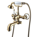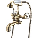 Комплектация - Держатель душевой лейки, душевой шланг, ручной душ, Назначение - Для ванны и душа, Покрытие - Бронза, Материал корпуса - Латунь, Встраиваемый - Нет, Донный клапан - Нет, Присоединительный размер - 1\2", S-образные эксцентрики - Есть, Термостат - Нет, Количество монтажных отверстий - 2, Длина излива - 213, Тип - Однозахватный, Тип подводки - Жесткая, Форма излива - Традиционная, Высота - 26.4, Поворотный излив - Нет, Цвет - Бронзовый, Аэратор - Есть, Глубина - 23