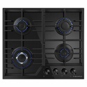 Поверхность: варочная панель • Тип поверхности: газовая • Рабочая поверхность: закаленное стекло • Число конфорок: 4 • Установка: независимая • Газовые конфорки: всего - 4 • Газ-контроль конфорок: есть • Тип управления: механическое • Переключатели: поворотные • Электроподжиг: есть, автоматический • Размеры: 590x515x51 мм • Размер ниши для встраивания: 560x485 мм • Цвет: панель - черный