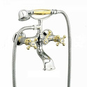 Назначение: ванна+душ • Конструкция: с раздельными клапанами • Монтаж: вертикальный • Материал: покрытие - золото • Монтажные отверстия: 2 отверстия • Форма излива: традиционная • Душевая лейка в комплекте: есть • Держатель для душевой лейки: на смесителе • Донный клапан в комплекте: есть