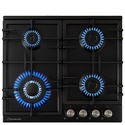 Поверхность: варочная панель • Тип поверхности: газовая • Рабочая поверхность: эмаль • Число конфорок: 4 • Установка: независимая • Газовые конфорки: всего - 4 (1 конфорка "Тройная корона") • Газ-контроль конфорок: есть • Тип управления: механическое • Переключатели: поворотные • Электроподжиг: есть, автоматический • Размеры: 580x510x100 мм • Размер ниши для встраивания: 560x490 мм • Цвет: панель - черный