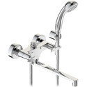 Покрытие - Хром, Встраиваемый - Нет, Назначение - Для ванны и душа, Присоединительный размер - 1\2", Поворотный излив - Да, Материал корпуса - Латунь, Форма излива - Традиционная, Количество монтажных отверстий - 2, Донный клапан - Нет, Тип - Двухзахватный, S-образные эксцентрики - Есть, Тип подводки - Жесткая, Термостат - Нет, Система быстрого монтажа - Да, Аэратор - Есть, Глубина - 33, Цвет - Серебристый, Высота - 12.8, Комплектация - Смеситель, шланг, лейка, фиксируемый держатель лейки,набор креплений, инструкция, паспорт, гарантийный талон, Длина излива - 250, Ширина - 17.3