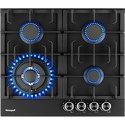 Поверхность: варочная панель • Тип поверхности: газовая • Рабочая поверхность: закаленное стекло • Число конфорок: 4 • Установка: независимая • Газовые конфорки: всего - 4 (1 конфорка "Тройная корона") • Газ-контроль конфорок: есть • Тип управления: механическое • Переключатели: поворотные • Электроподжиг: есть, автоматический • Размеры: 610x525x56 мм • Размер ниши для встраивания: 555x475 мм